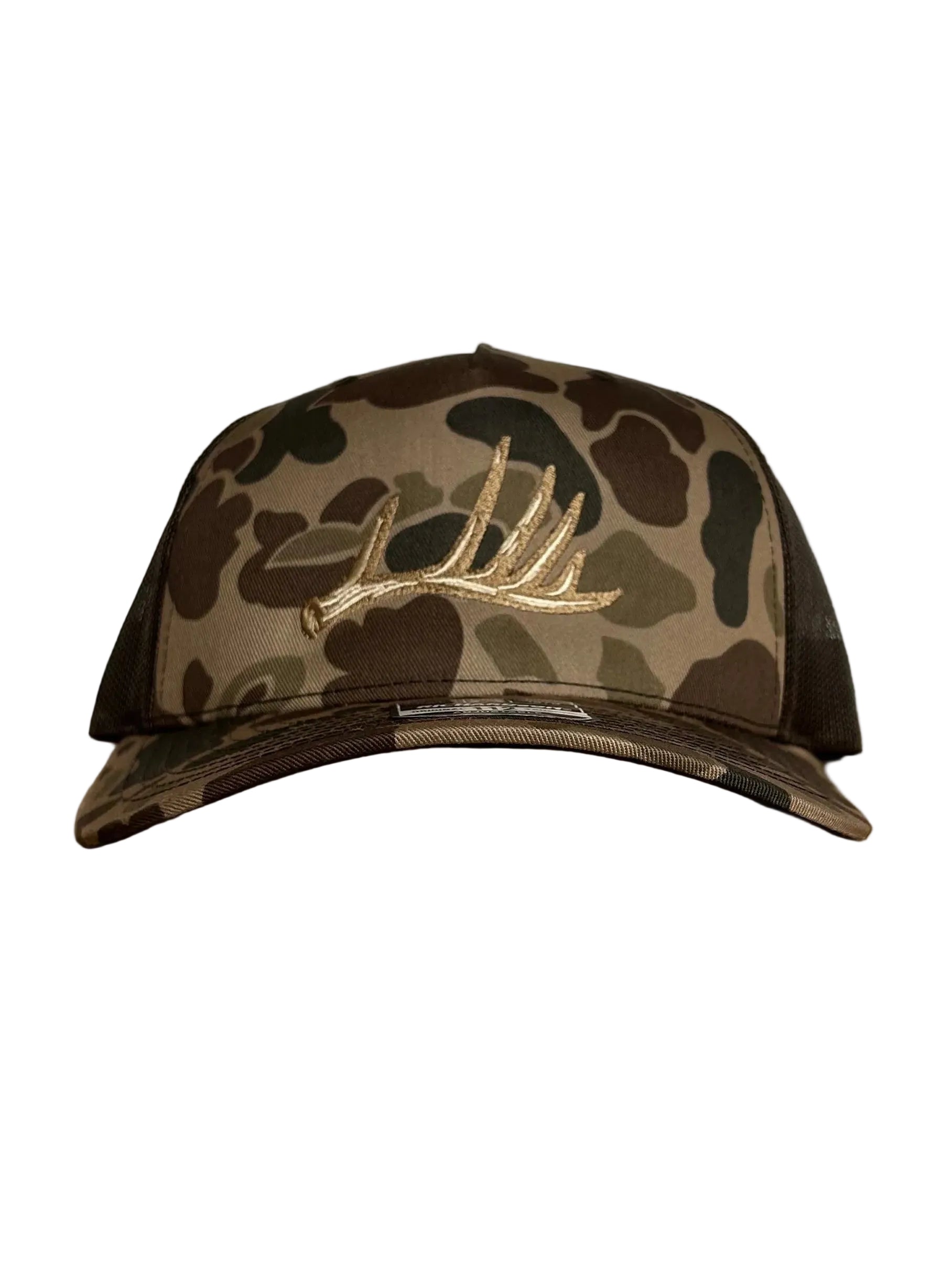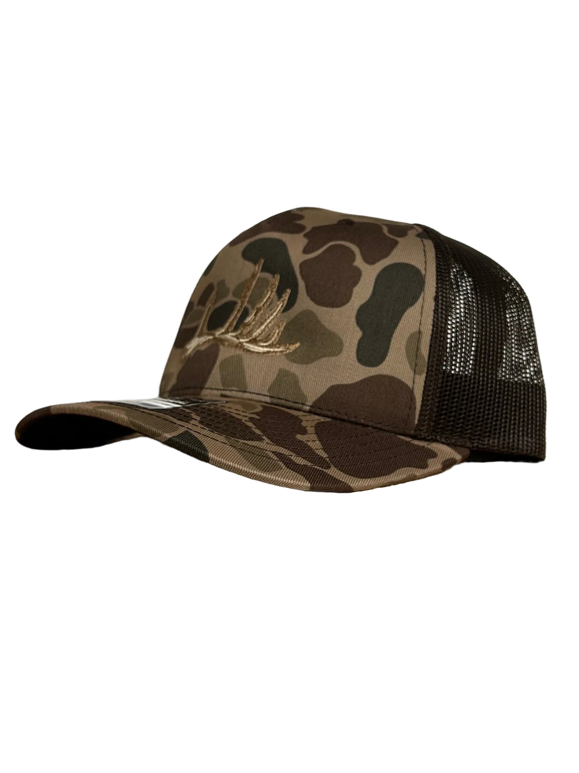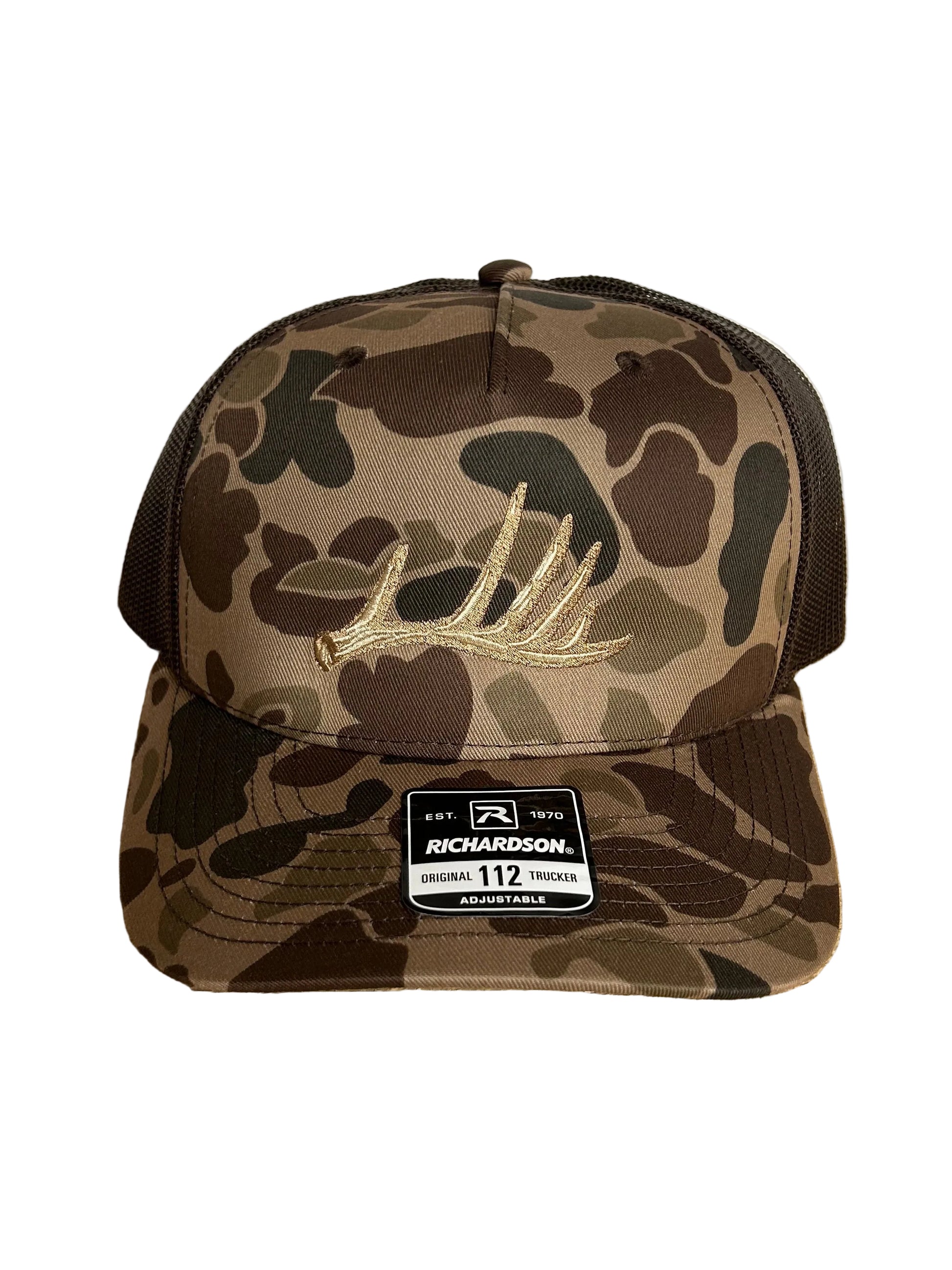 Nothing says woods and whitetails like a fresh set of sheds. The Timber Tines 112 takes that feeling and stitches it front and center with a clean antler shed design. Set on the classic Richardson 112 trucker in rugged duck camo, it’s built for hunters, shed finders, and anyone who feels at home in timber country.